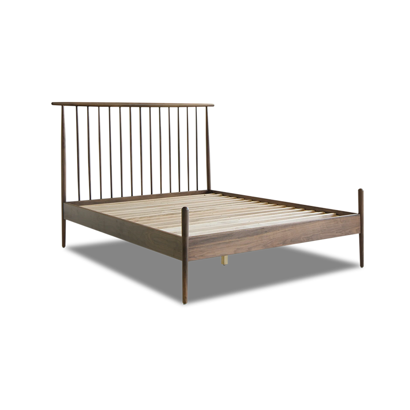 This wooden bed features a minimalist design with a slatted headboard. The rich wood tone exudes elegance, while its sturdy construction ensures reliable support for restful sleep.