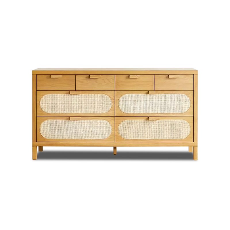 Featuring oval rattan-woven doors, this cabinet pairs light wood with natural rattan for a unique, elegant look. The sturdy structure balances aesthetic appeal with practical use.