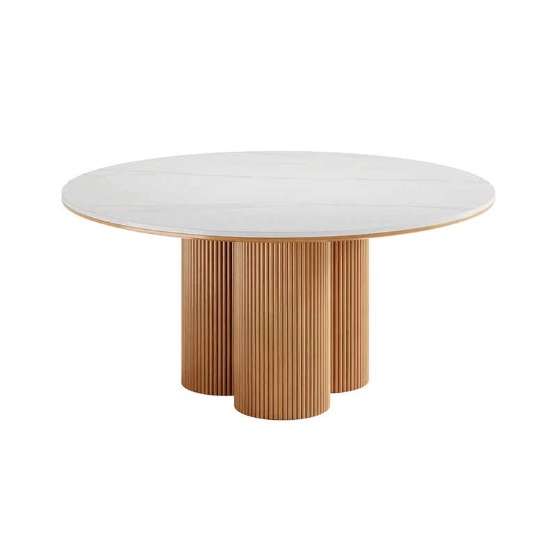 This round marble-top table stands on a base formed by three verticallyslatted cylindrical legs, creating a sculptural and balanced design.