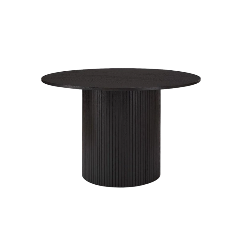 This round walnut table is characterized by a cylindrical base and vertical slats, providing a warm and refined appearance.