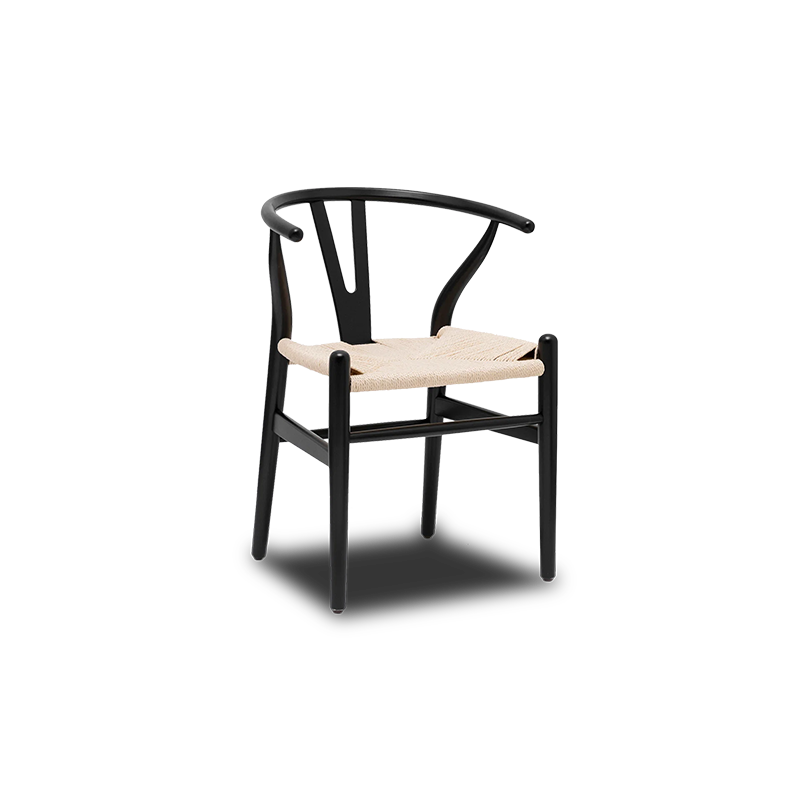 This black Y-back chair features a gracefully curved frame and woven seat, combining elegance with a sense of sturdy reliability.