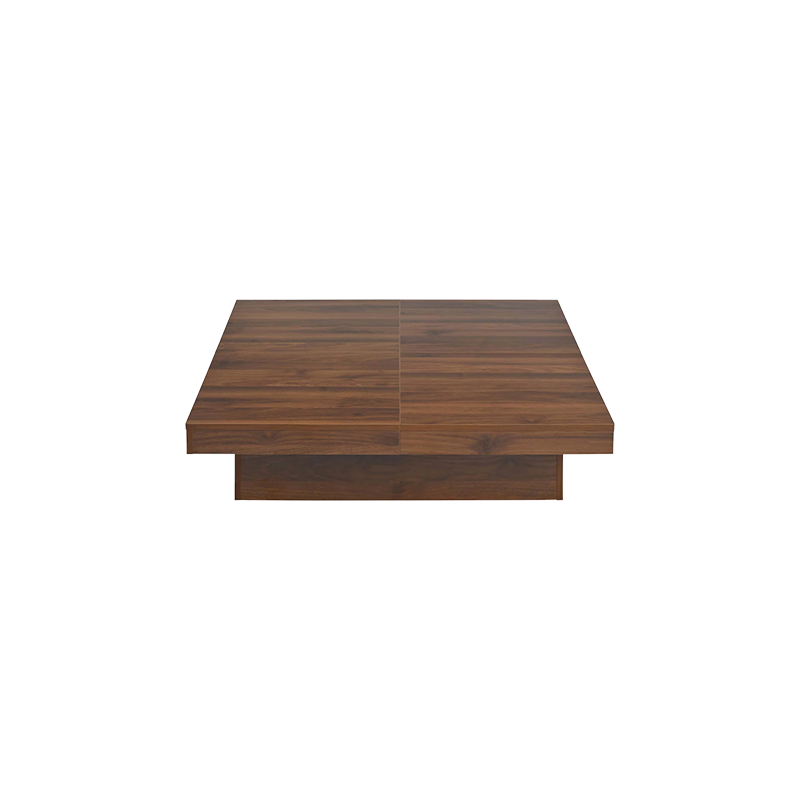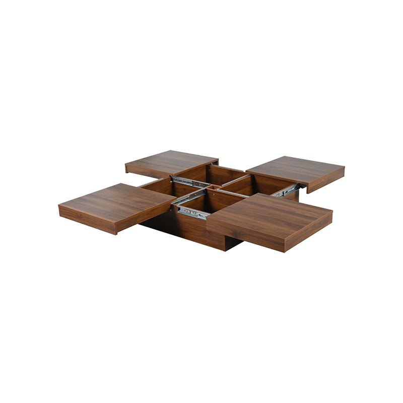 Square wooden table with hidden storage compartments. Functional and stylish, ideal for keeping items