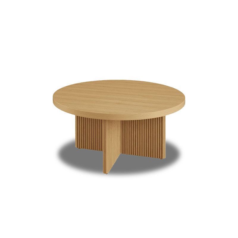 Round wooden table with a fluted base. Simple design, smooth surface, adds a touch of elegance to any