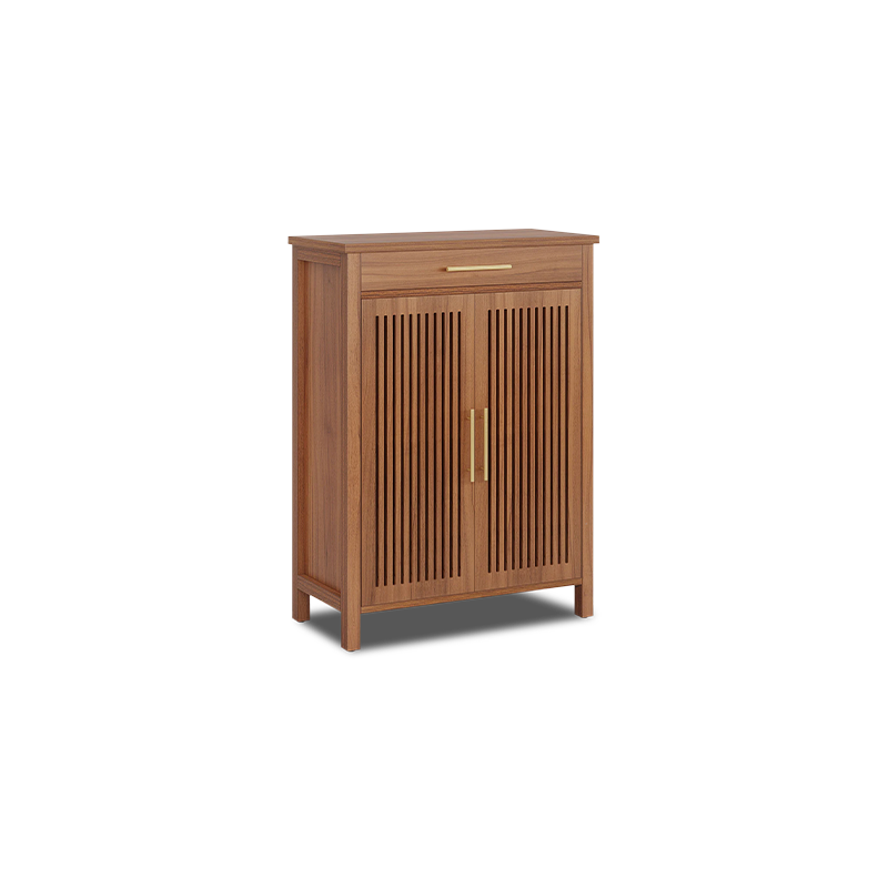 Fine wood construction, warm tone. Vertical slats with brass handles for elegance. Drawer and double – door storage, stylish & reliable.