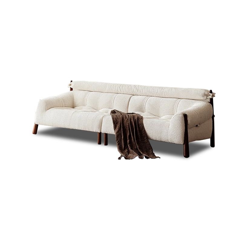 Textured, creamy fabric, unique headrest. Well-crafted for comfort.