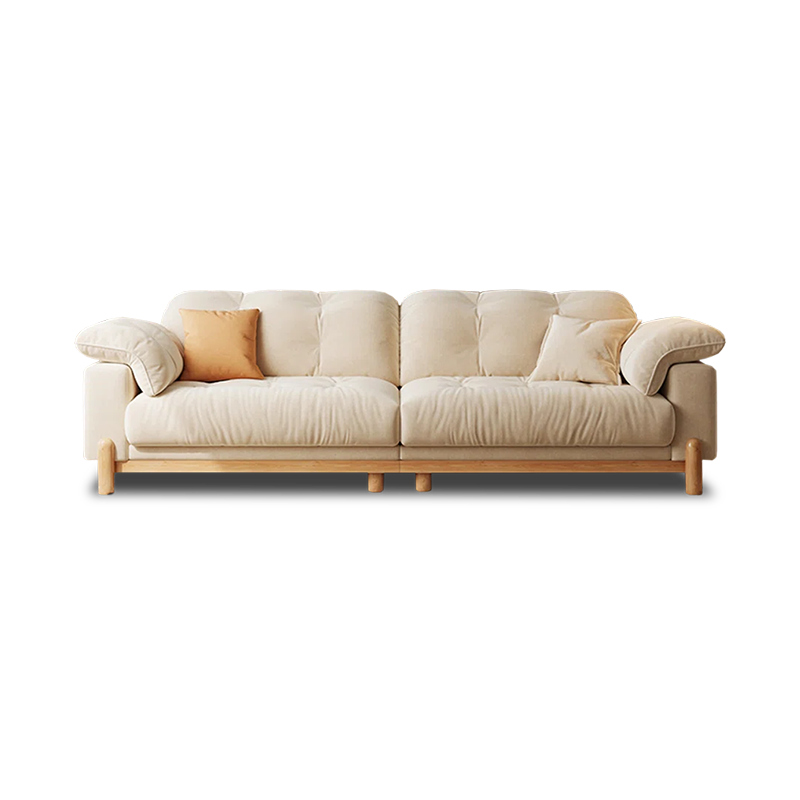 Beige with tufting, relaxed look. Wooden legs add nature. Sturdy for daily use.