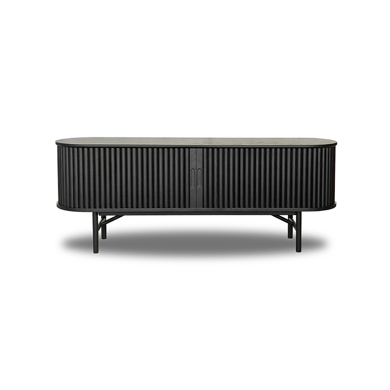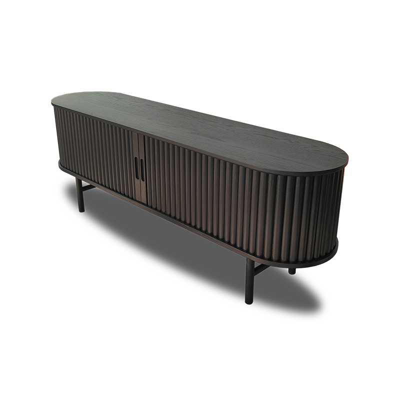 In a dark wood finish, oval – shaped with vertical stripes on the surface. The double – door design offers large – capacity storage, and the slender legs add a touch of refinement.