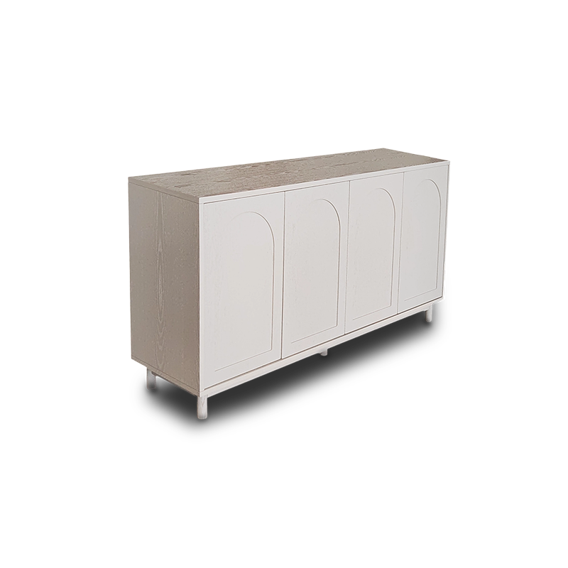 Sleek and functional, this white sideboard features four cabinet doors for ample storage. Its clean design and smooth finish make it a perfect fit for modern dining spaces.