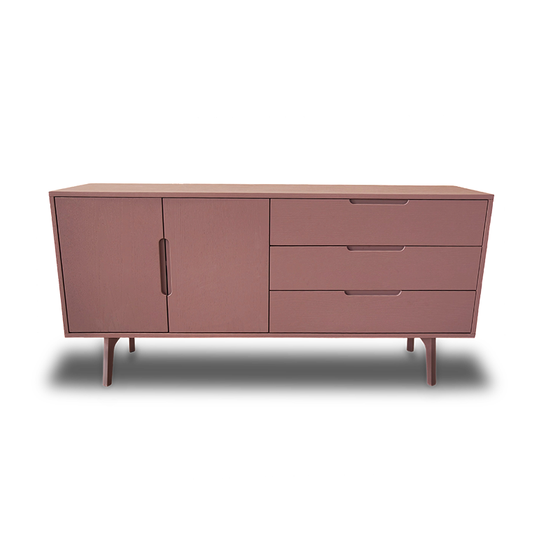 Modern long pink sideboard featuring three drawers and two swing doors. Its soft color and clean lines add a gentle, stylish touch to any room.