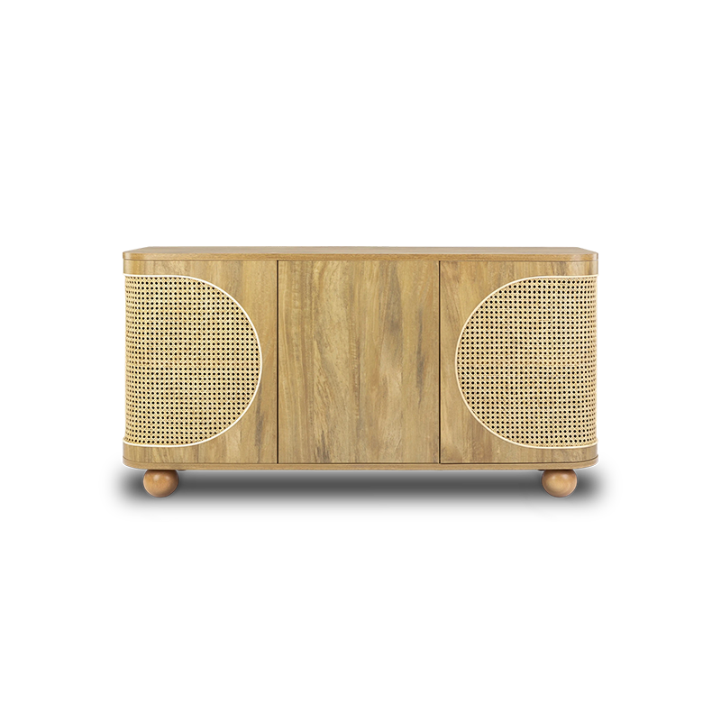 Vintage sideboard with curved woven door accents and round ball legs. A timeless piece with unique character.